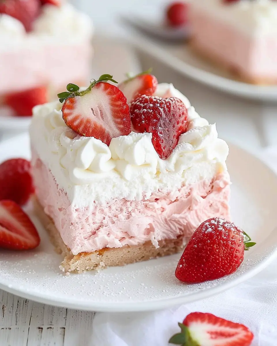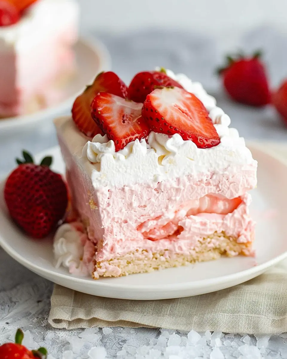 Once you’ve followed these steps, you’ll have a delectable 3 Ingredient No Bake Strawberry Cloud Cake that’s ready to impress your friends and family. Serve it chilled, and don’t forget to enjoy the compliments you receive!
