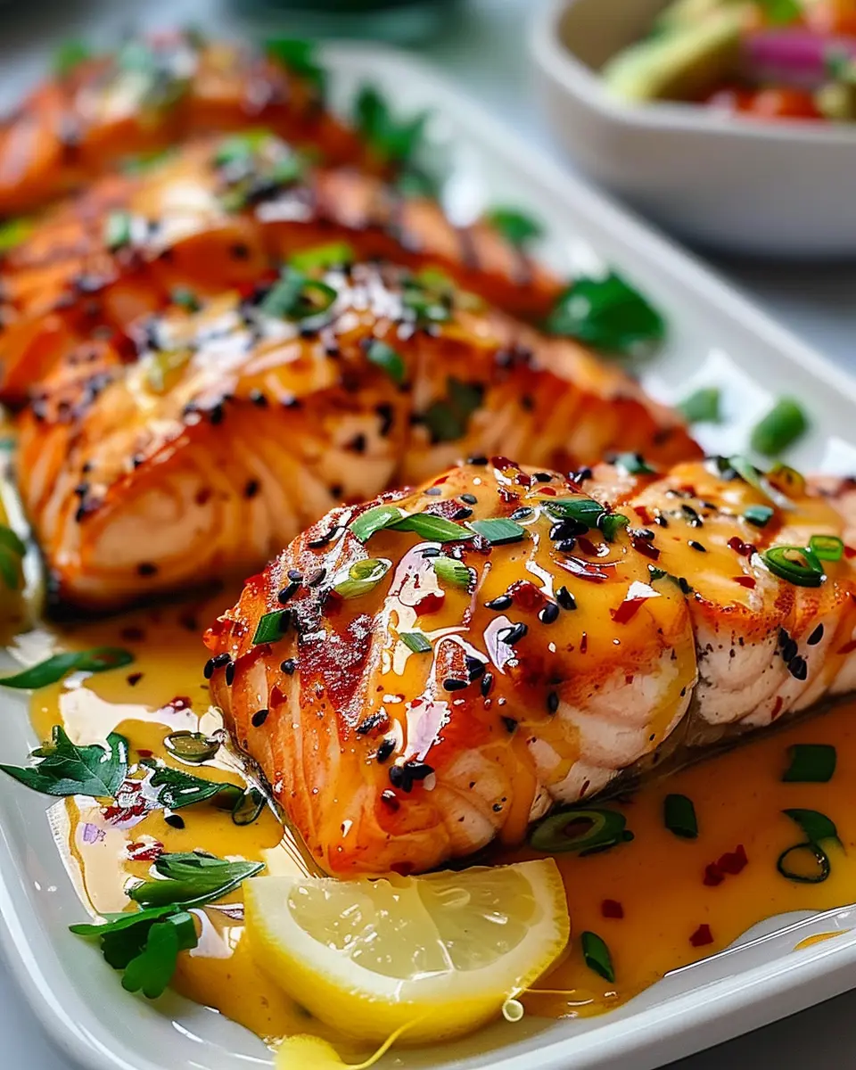 • Presentation: Place the cooked salmon fillet on a dish, and generously drizzle the Bang Bang Sauce over it.