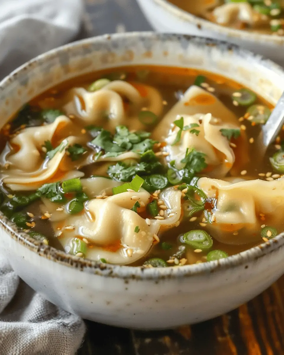 A comforting bowl of potsticker soup filled with rich flavors and comforting textures.