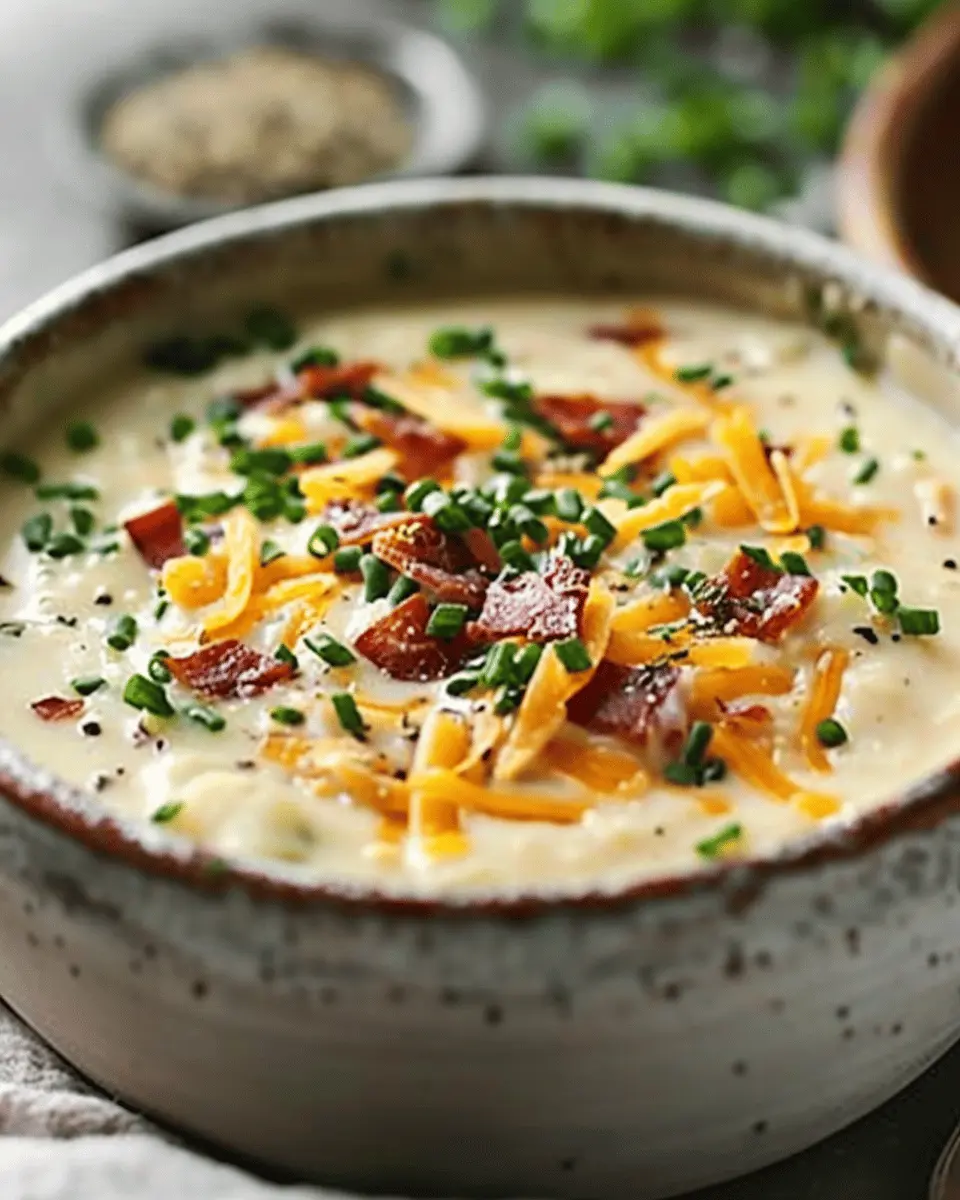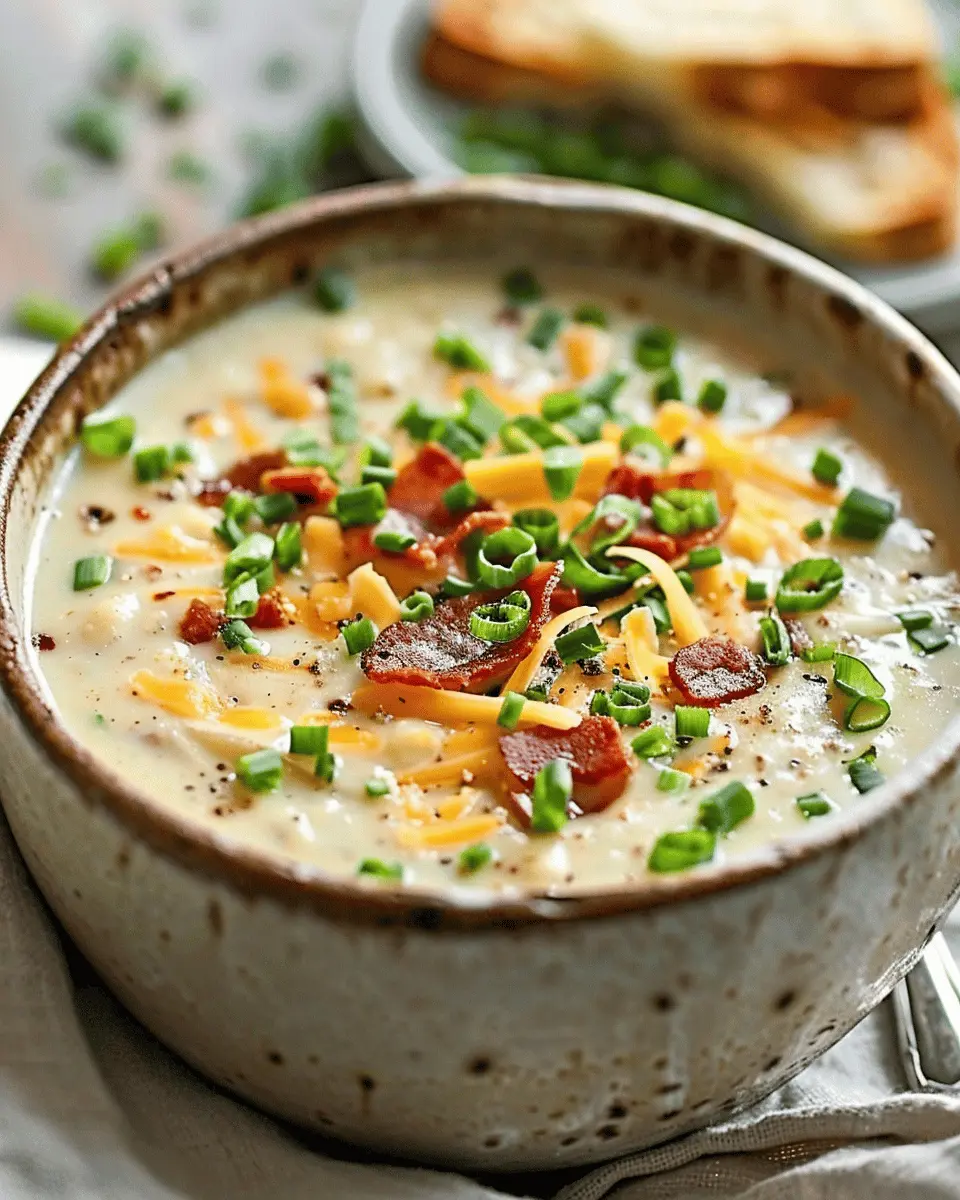 A rich and creamy baked potato soup made with turkey bacon, perfect for a cozy meal.