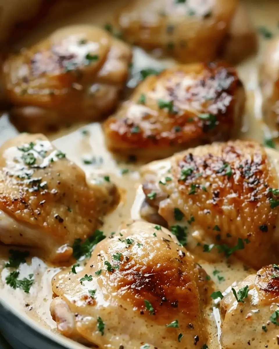 Enjoy this creamy oven baked chicken thighs recipe that brings comfort and delight to your dinner table.