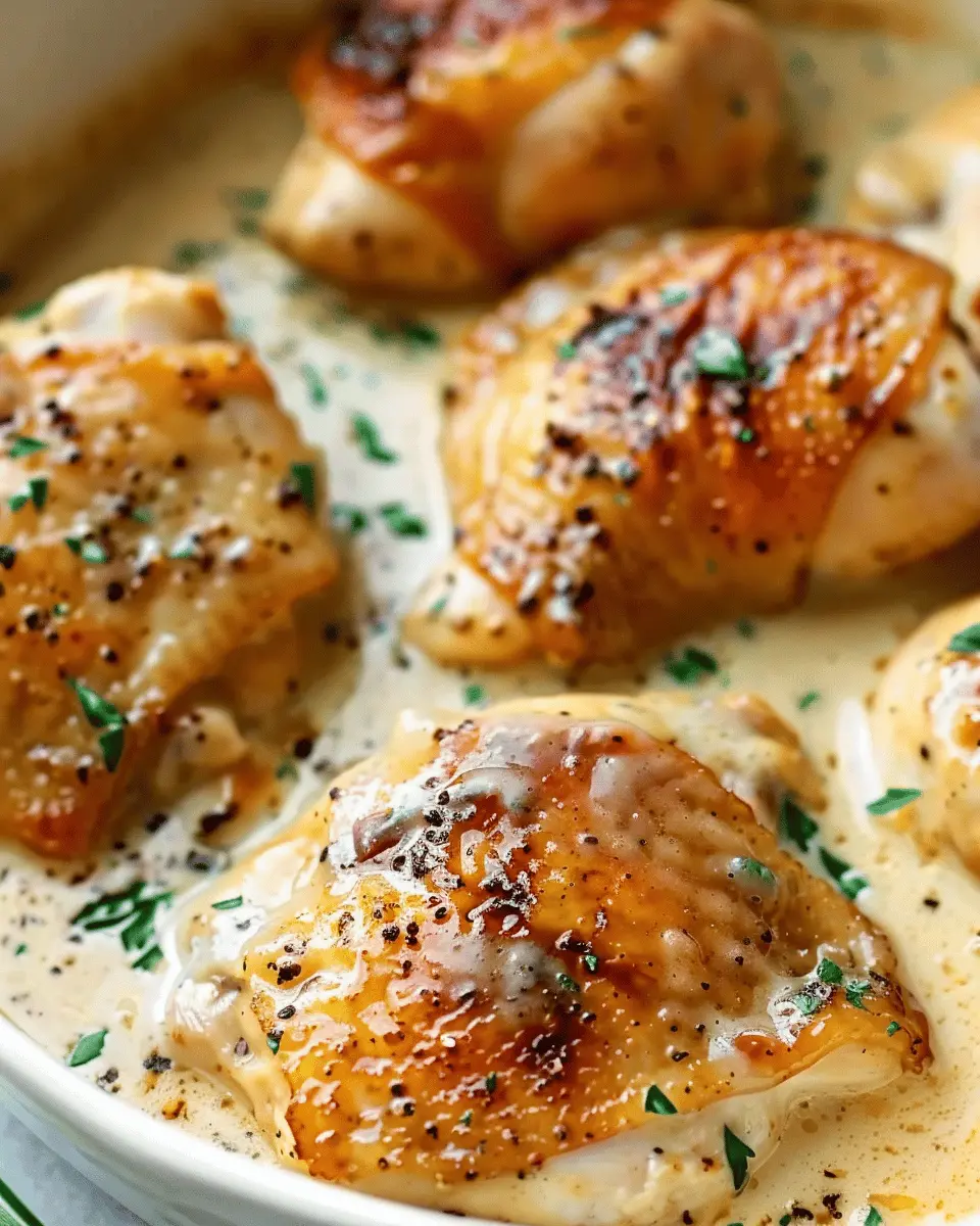 - Place the seared chicken thighs in a baking dish and pour the cream mixture over the top.