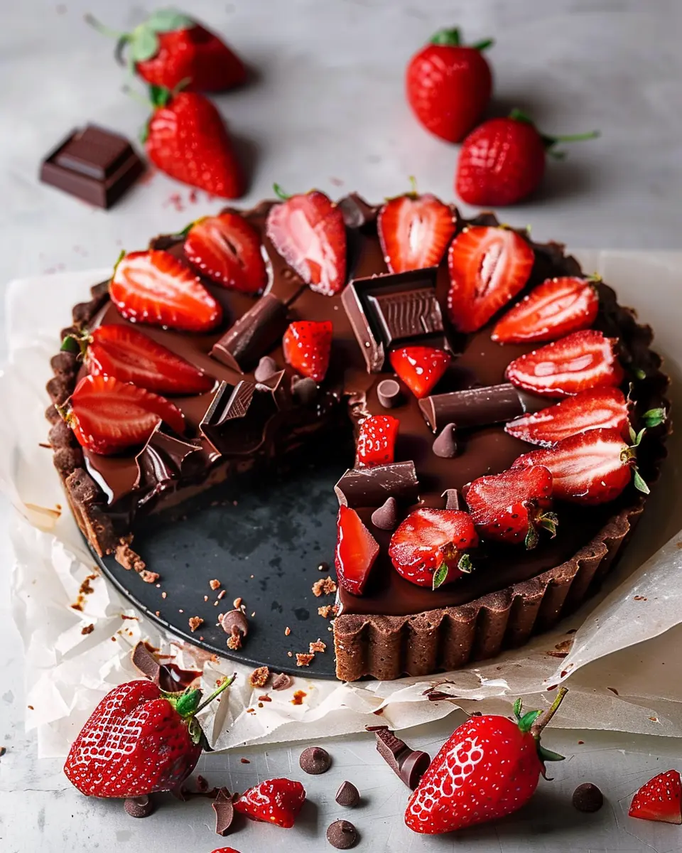 A rich and creamy tart filled with dark chocolate and topped with fresh strawberries.