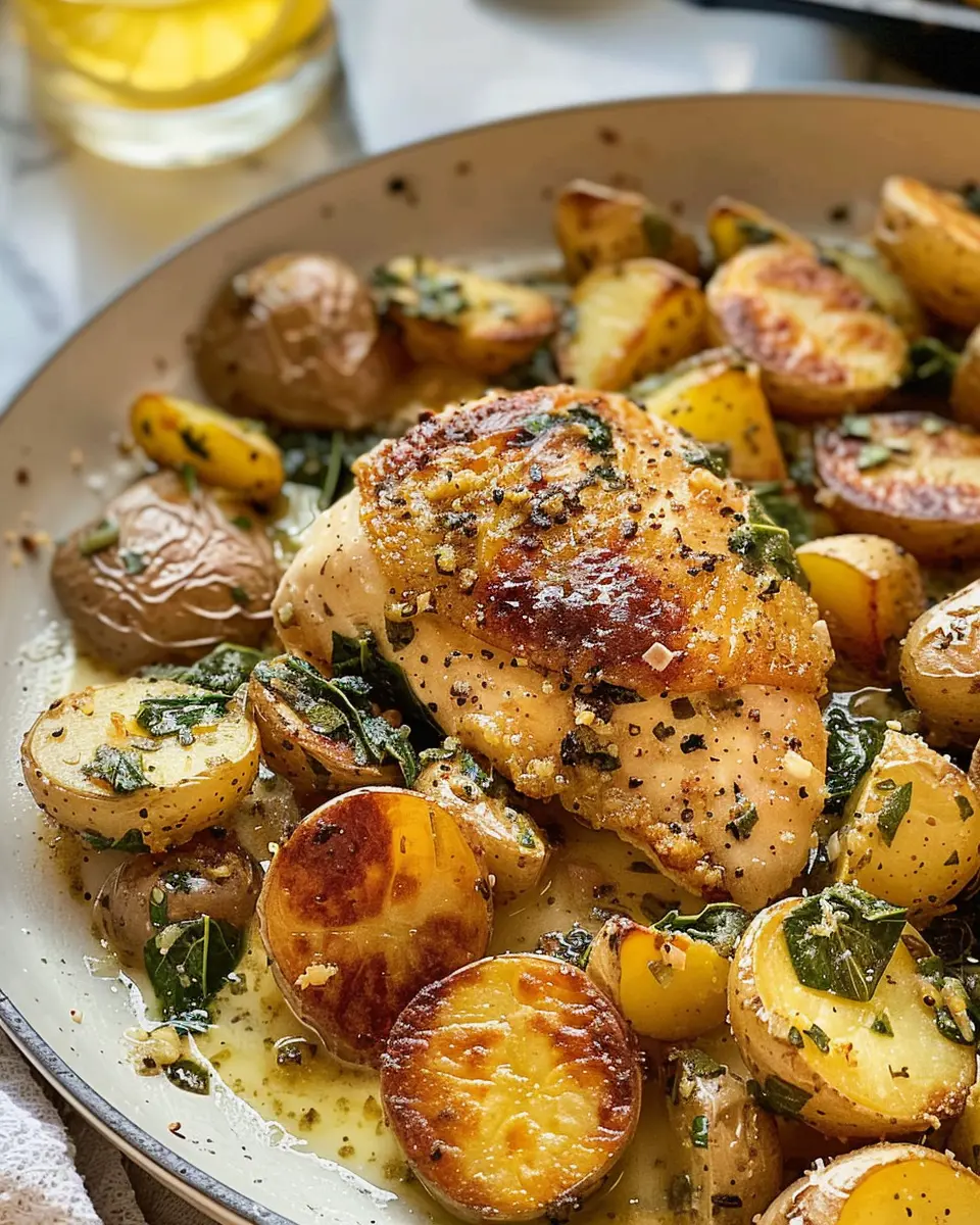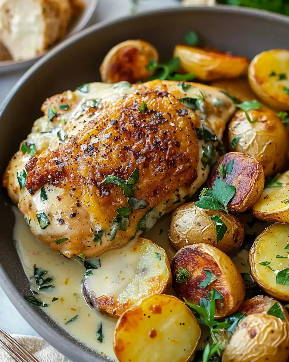 Garlic Parmesan Chicken & Crispy Roasted Potatoes the Garlic Herb Sauce is a delicious one-pan dish that everyone will love.
