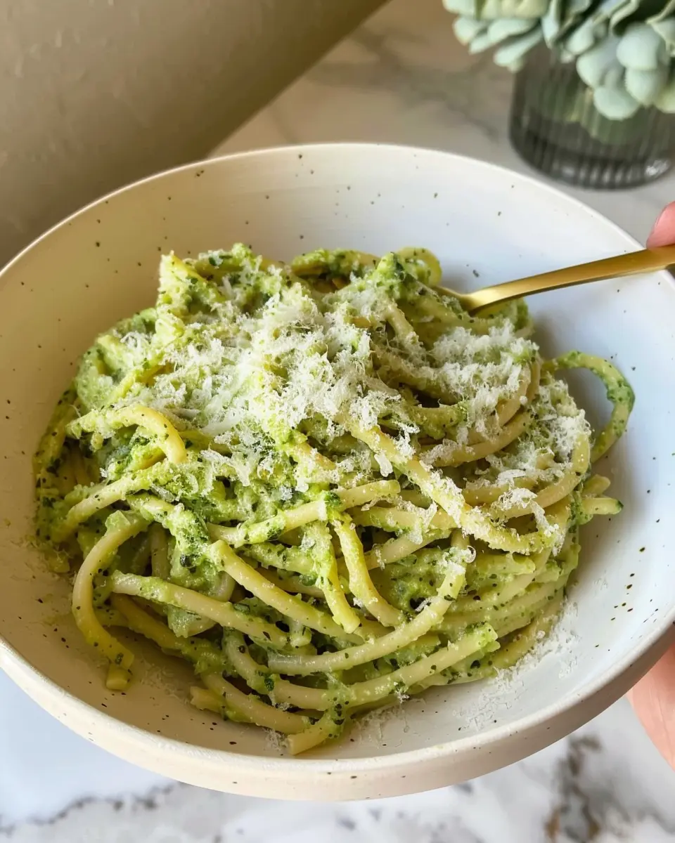• Carefully mix until every strand is coated in that rich green goddess flavor. If it looks too dry, don’t hesitate to add a bit more reserved pasta water to ensure everything is nicely blended.