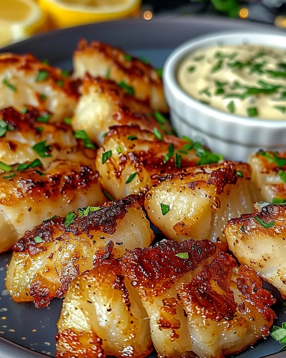 Enjoy delicious Lemon Butter Fish Bites accompanied by creamy Garlic Aioli, a perfect dish for any occasion.