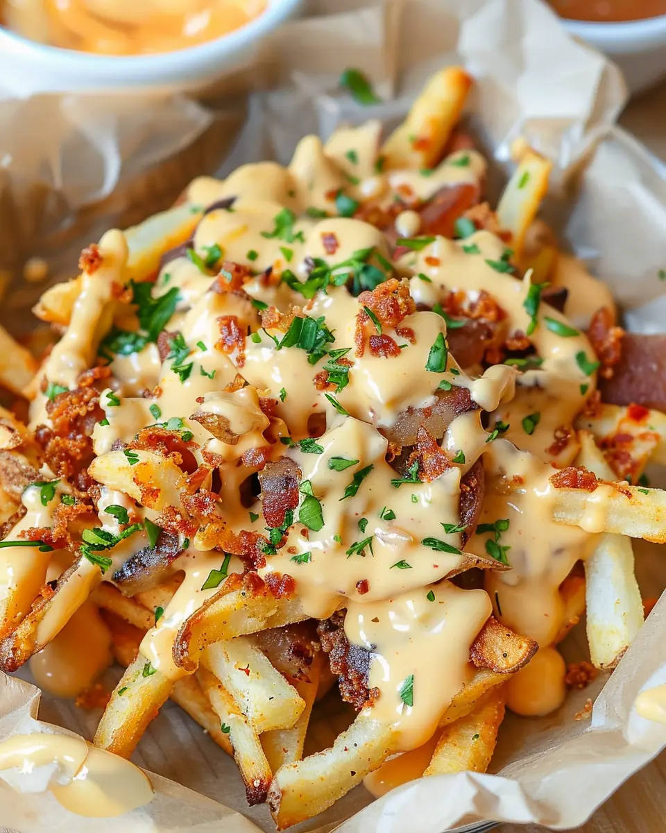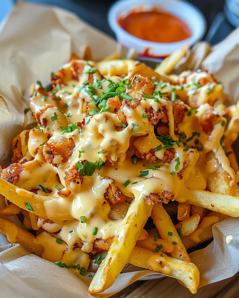 Once those fries are perfectly crisp and your cheese sauce is bubbling away, it’s time to combine the two. In a large bowl (or on a serving platter for maximum wow-factor), layer the fries and then generously drizzle the cheese sauce all over them. Sprinkle diced chicken ham or turkey bacon on top, followed by green onions for a pop of color and flavor. This step not only enhances the taste but also makes for a breathtaking presentation.