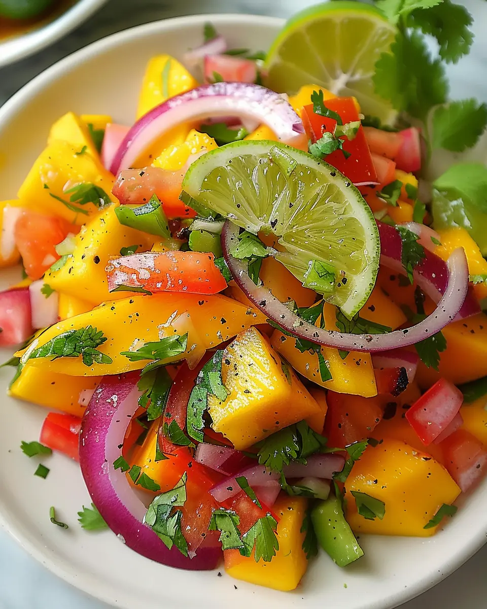 Enjoy a delicious and refreshing mango salad dressed with a zesty lime dressing perfect for summer gatherings.