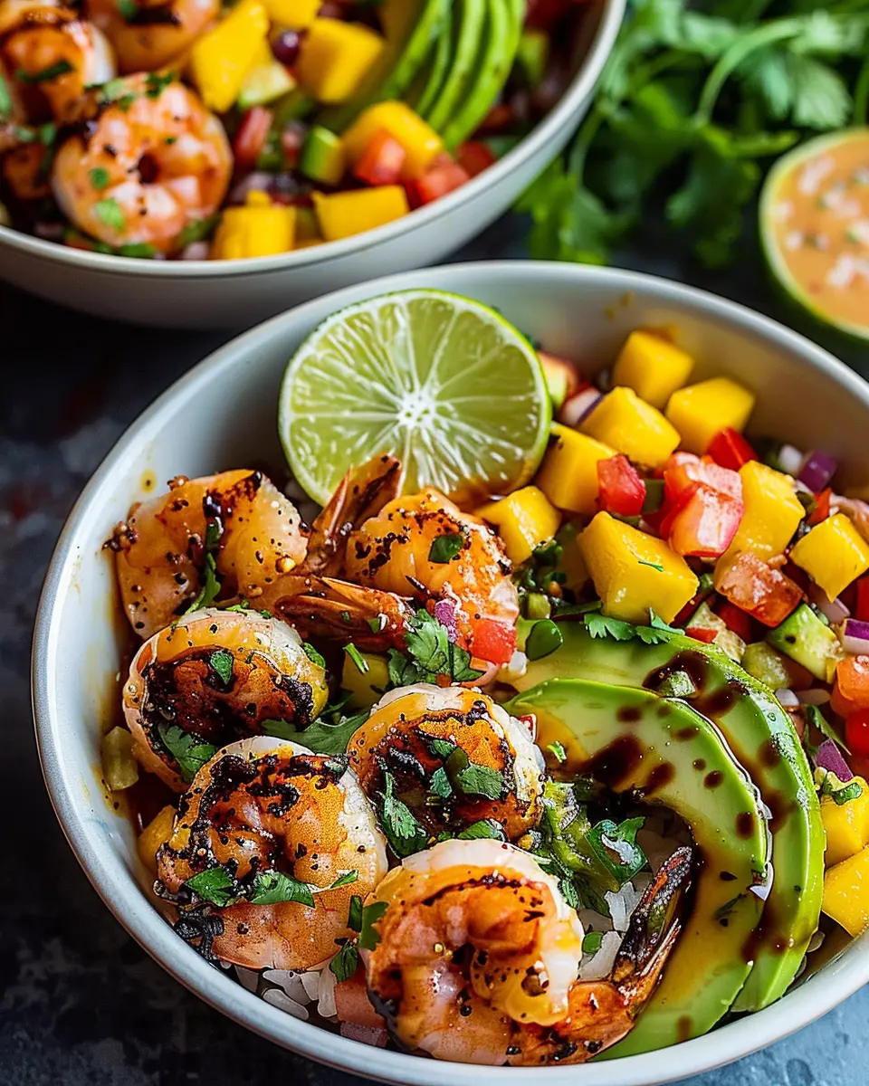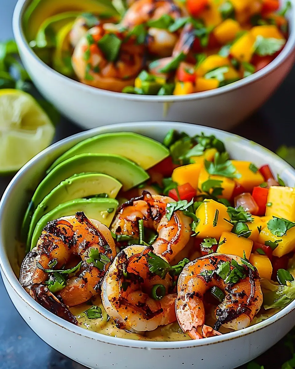 Delicious and refreshing shrimp and avocado bowls topped with vibrant mango salsa and a zesty lime-chili sauce.
