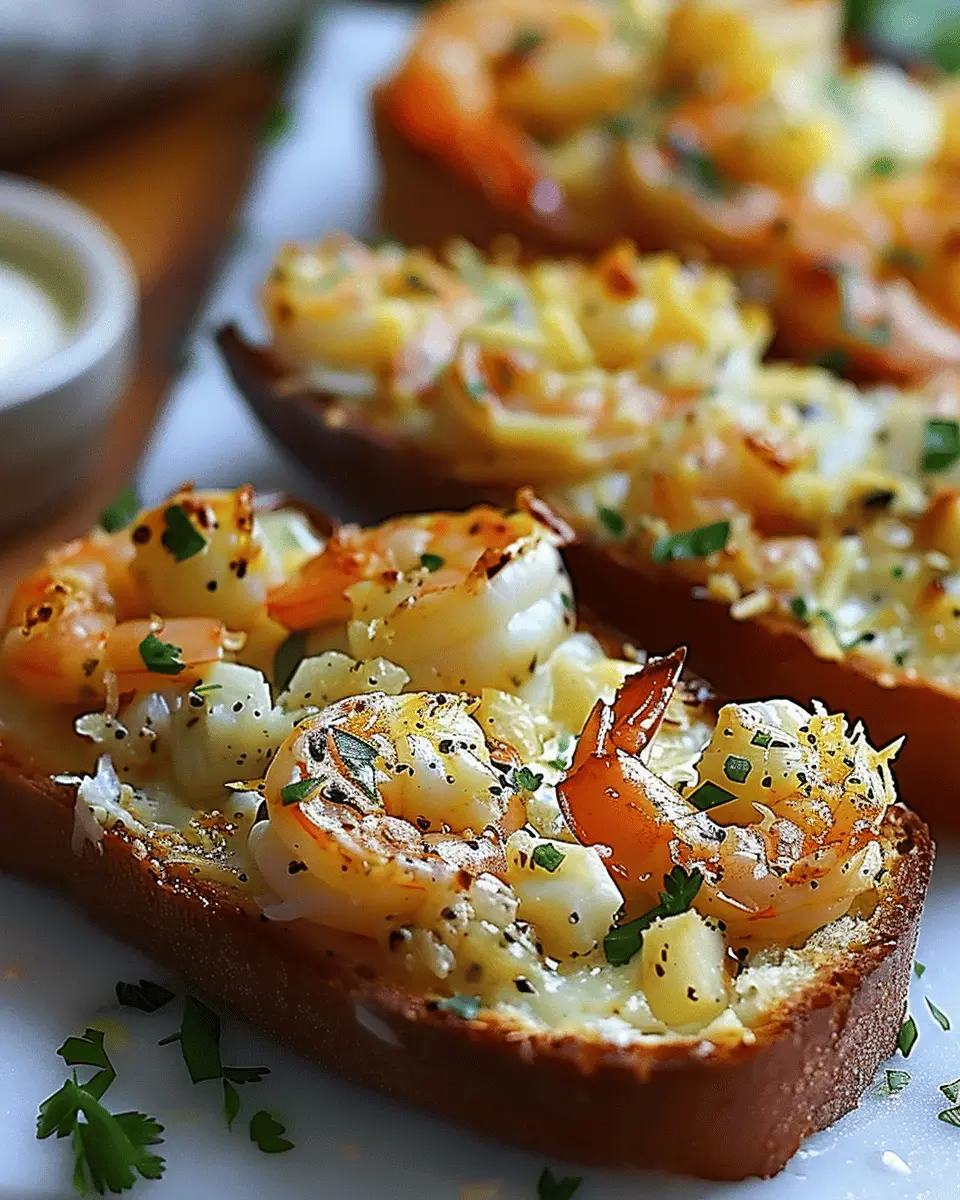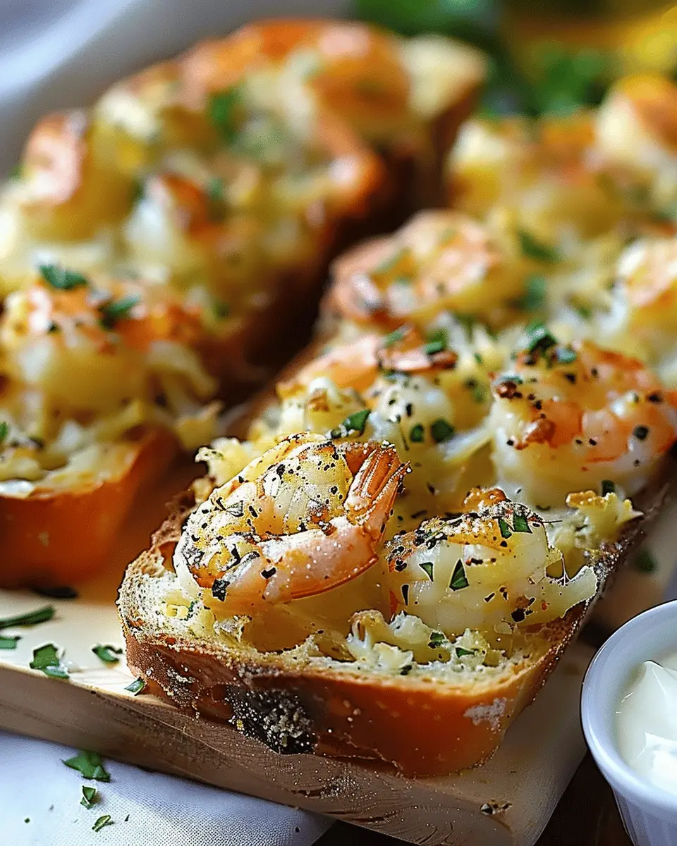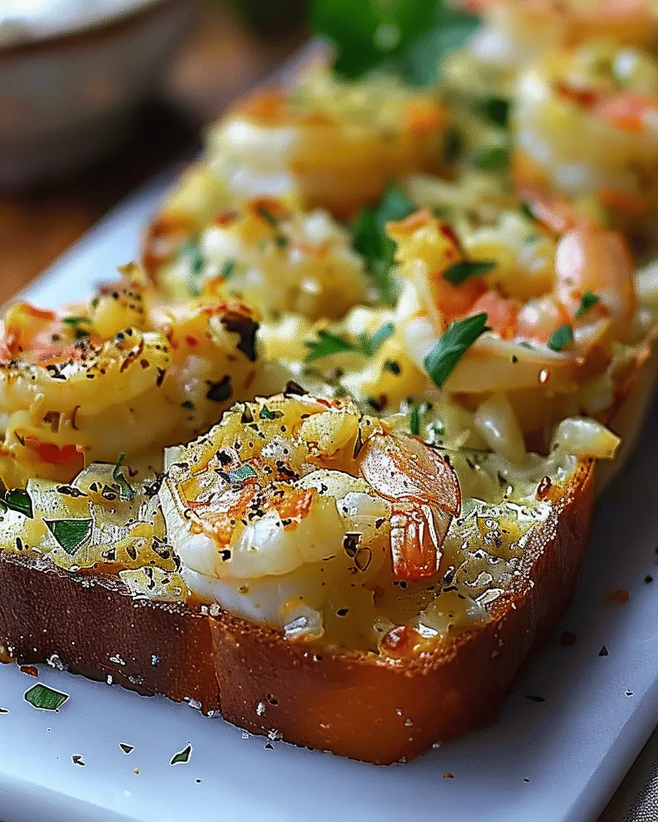 Indulge in this decadent Shrimp and Jumbo Lump Crab Garlic Bread, perfect for seafood lovers.
