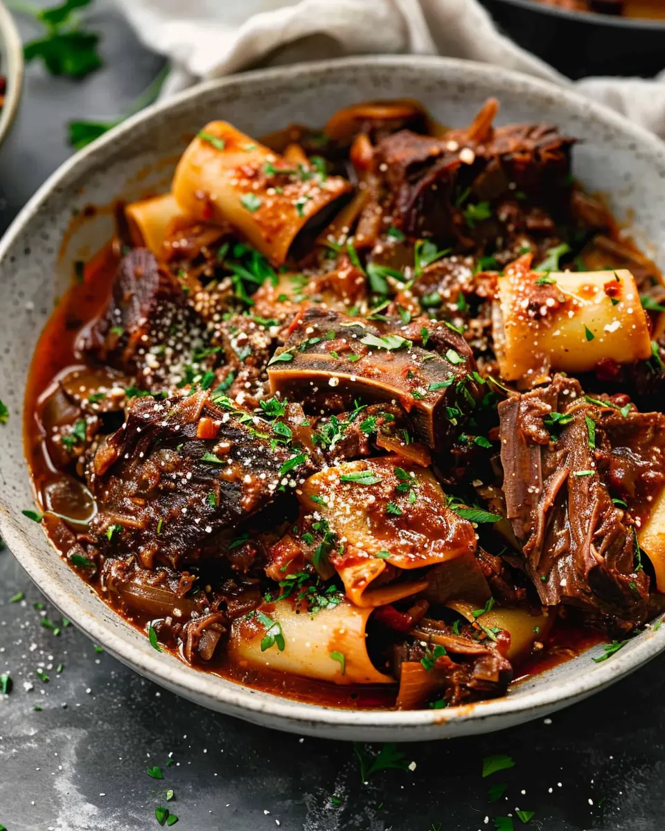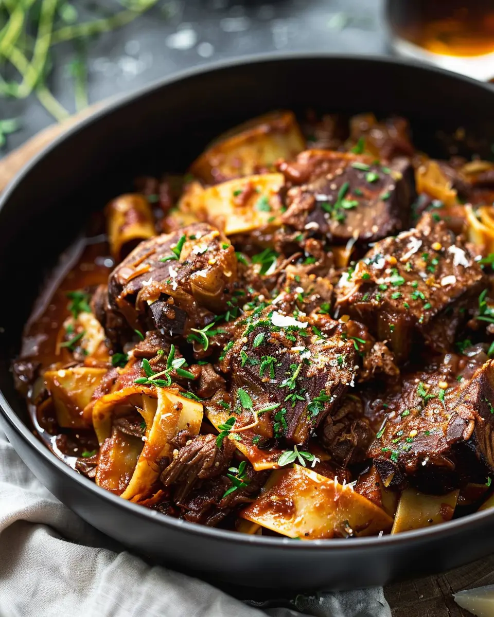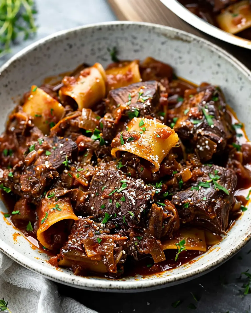 A rich and savory ragu made with slowly braised beef short ribs, perfect for a comforting meal.