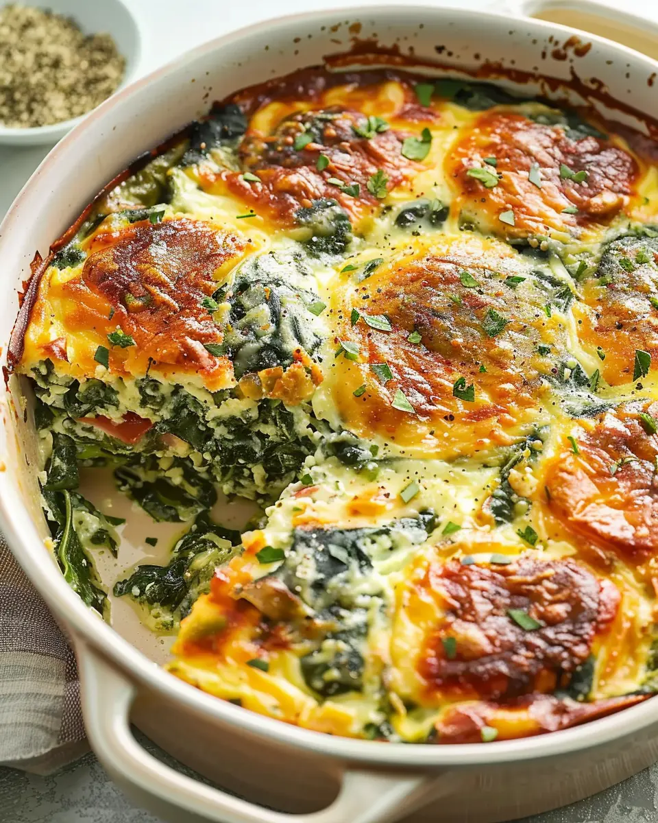• Layer the filling: Start by placing half of the egg and spinach mixture in the dish. Sprinkle a layer of turkey bacon or chicken ham (your choice), followed by another layer of the egg mixture. If desired, top everything with extra mozzarella for that melty finish.