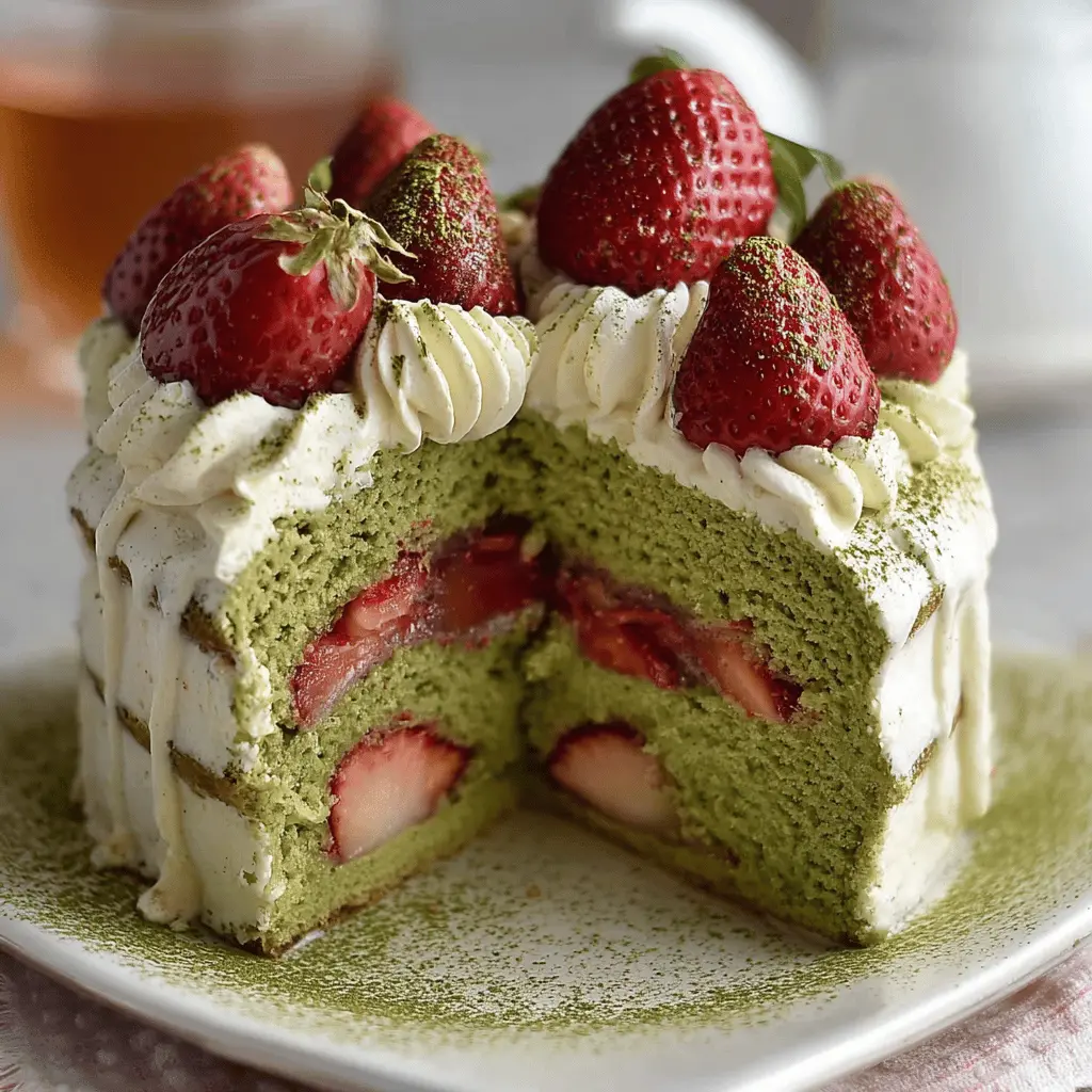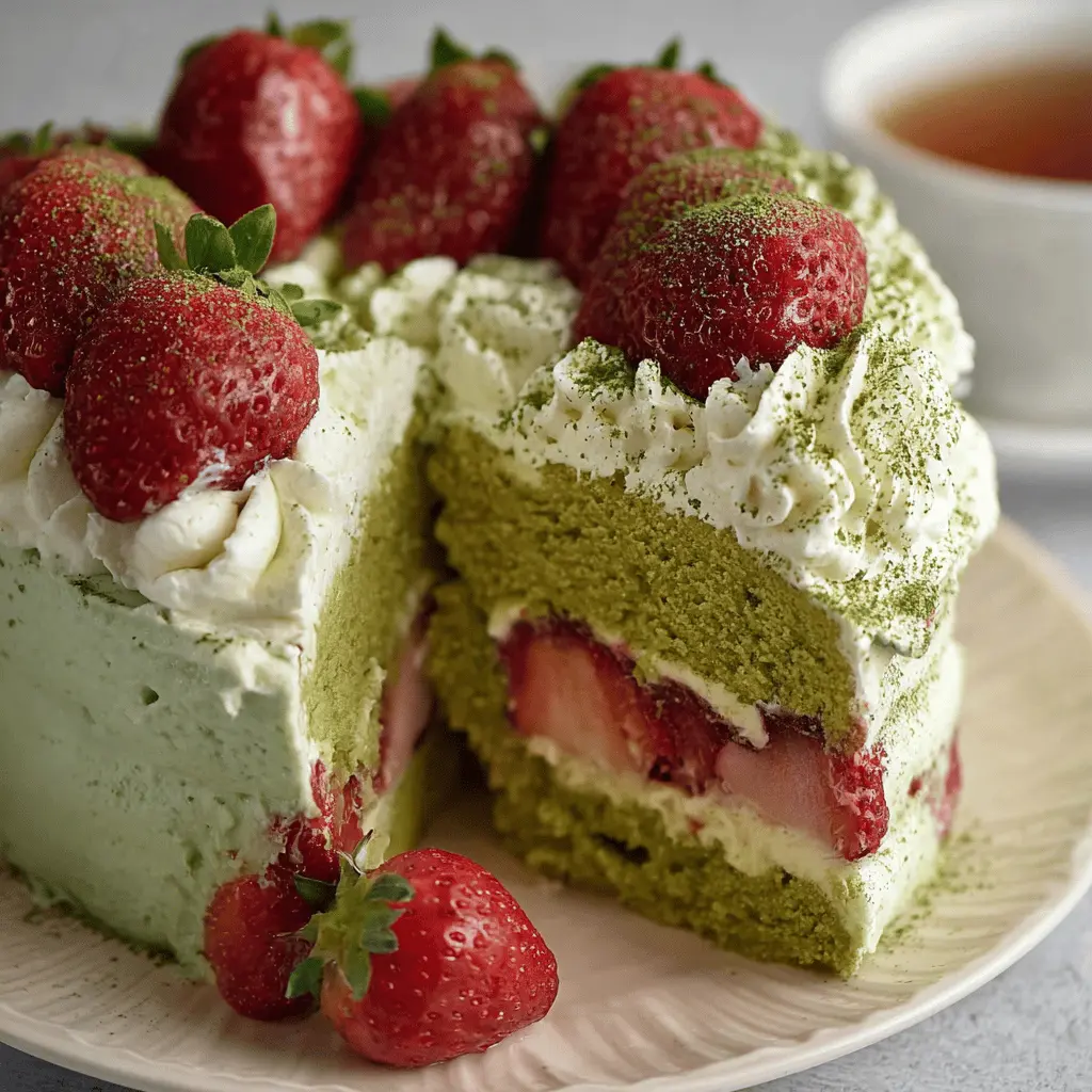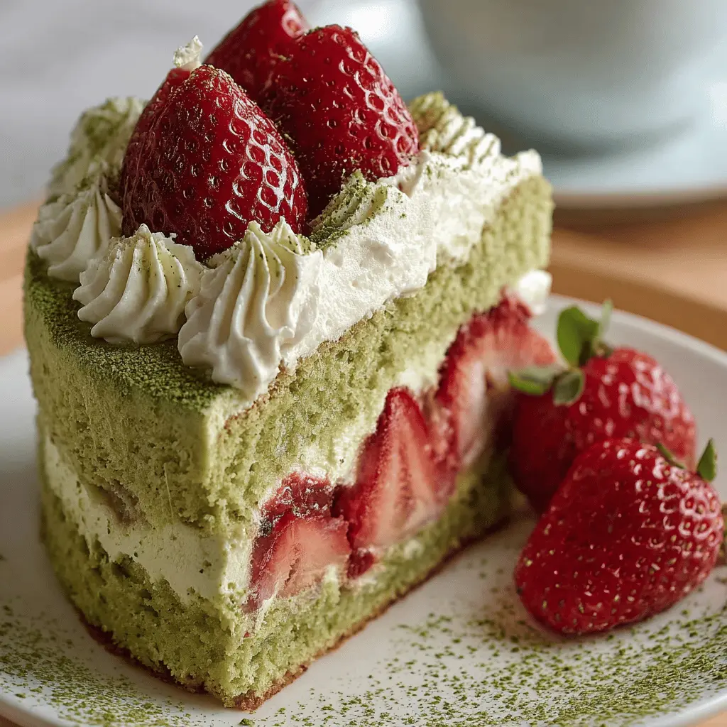 Indulge in the delightful flavors of Strawberry Matcha Cake topped with luscious Matcha Whipped Cream. Perfect for any occasion!